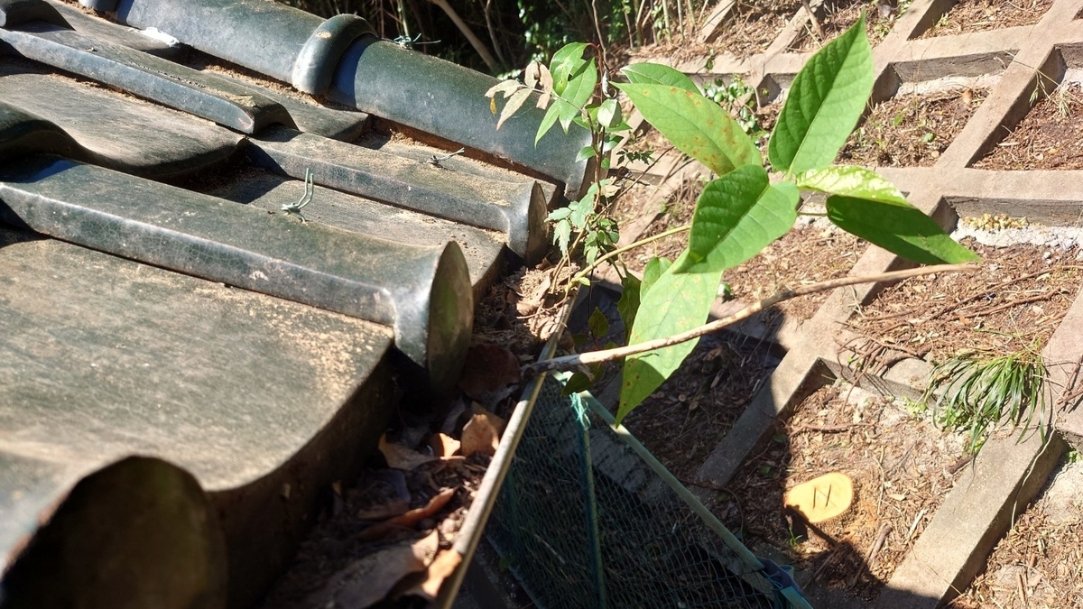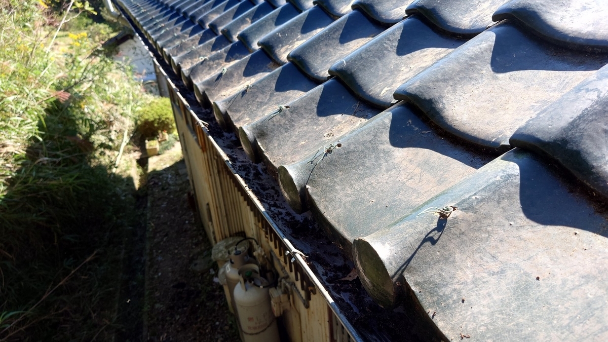 屋根に積もった葉っぱをホウキで掃き落とし、綺麗にしてから雨樋の掃除です。この瓦はそもそも滑るのに加え、葉っぱが積もっていたところは汚れが残っているので、ズルズルに滑ります。屋根上からの掃除は危ないので、下から高い脚立を使っての掃除になります。